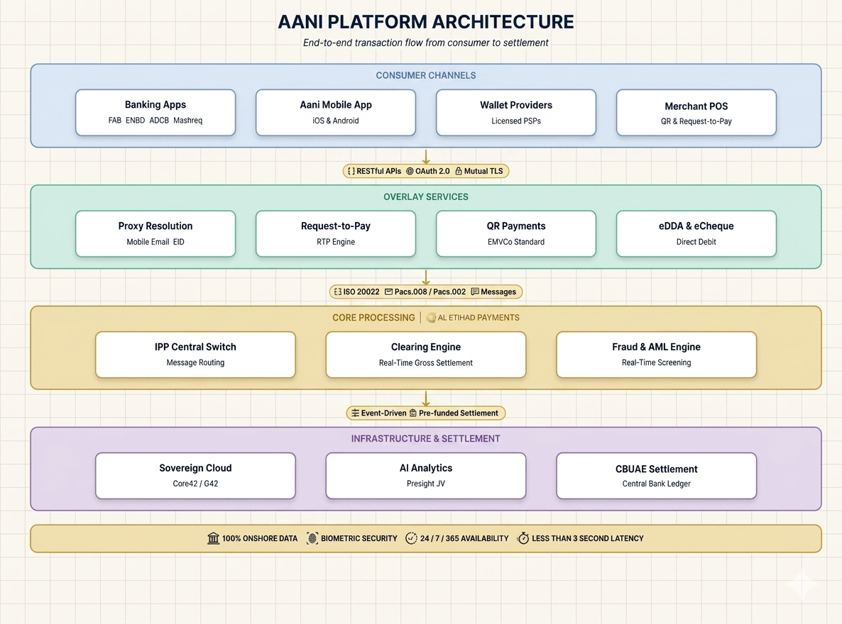 Aani looks like a simple app when you use it. But underneath, it is a careful piece of national infrastructure — cheaper than cards, faster than bank transfers, safer than cash, and designed to keep the economics of UAE commerce inside the UAE.