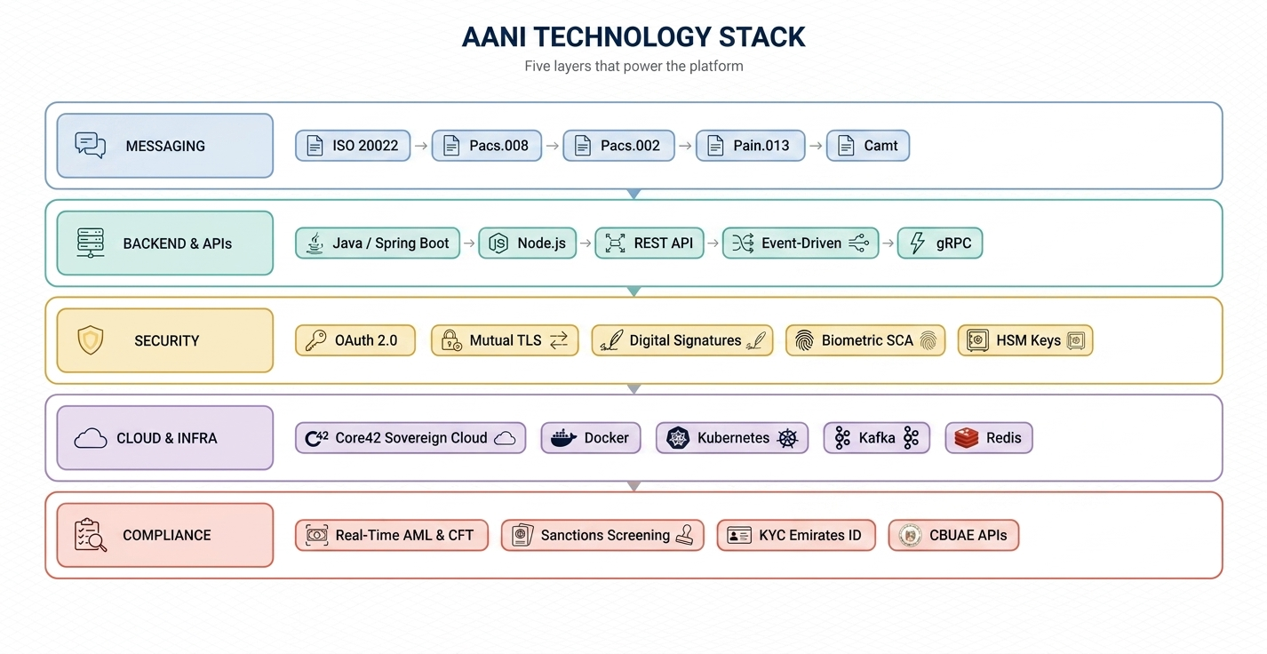 Figure 5 — The five technology layers that power Aani — from messaging down to compliance