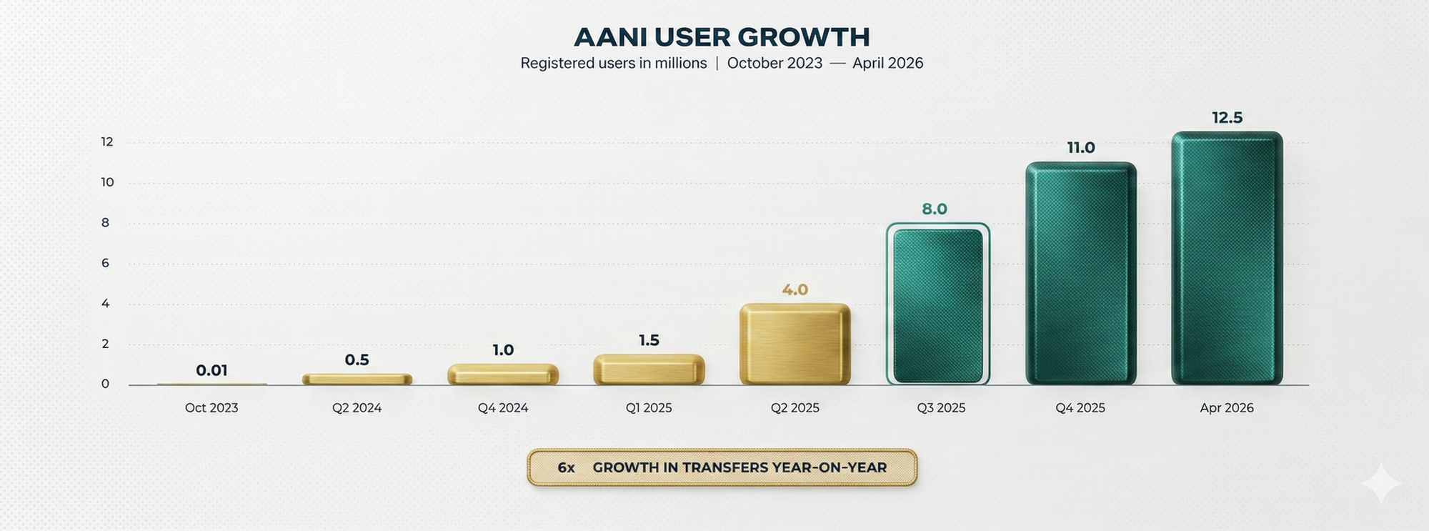 Figure 1 — How fast Aani grew: from pilot to 12.5 million users in under 30 months