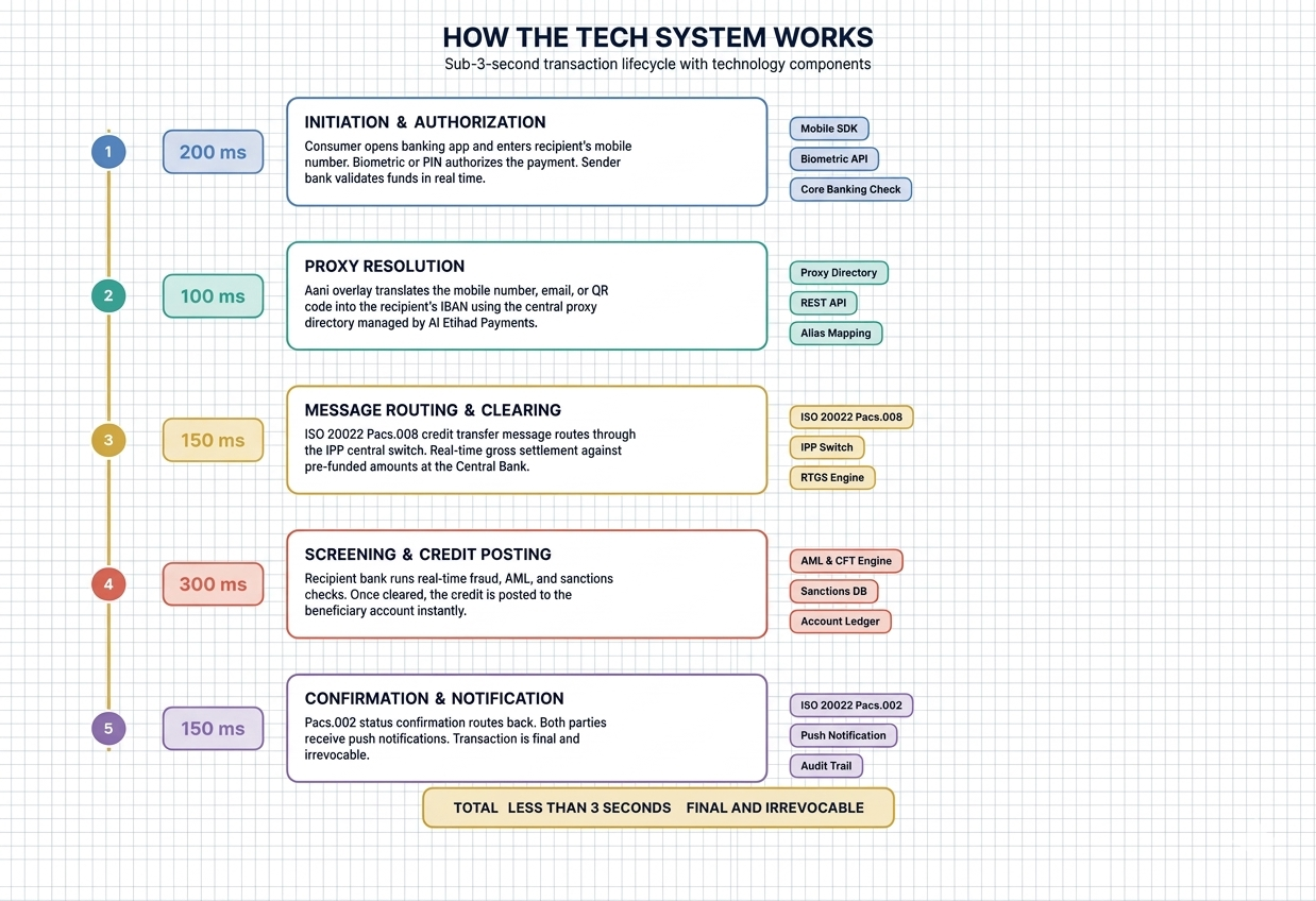 Let us walk through what happens when you send your friend AED 100 over Aani. The whole thing takes under three seconds, but each of those seconds contains real work.