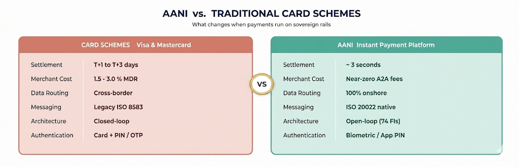 Figure 2 — Side-by-side: what changes when payments move from cards to Aani rails